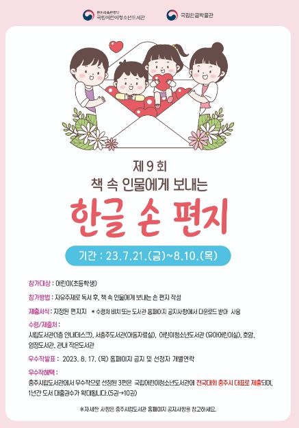[제주교통복지신문 김강석 기자] 충주시립도서관은 관내 초등학생을 대상으로 오는 8월 10일까지 ‘제9회 책 속 인물에게 보내는 한글 손편지 ’ 공모전 참가자를 모집한다.