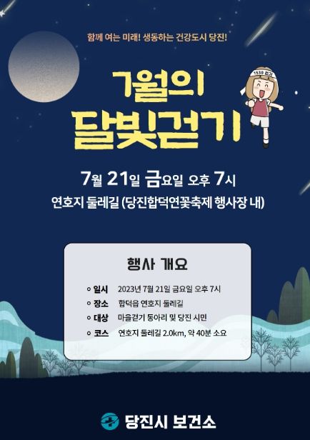 [제주교통복지신문 김강석 기자] 당진시보건소가 7월 21일 저녁 7시 연꽃이 만발한 연호지에서 ‘7월의 달빛 걷기’행사를 진행한다.