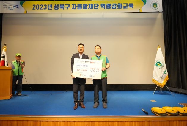 이날 교육에 앞서 자율방재단은 집중호우로 인한 피해 복구와 이재민들에 대한 지원이 신속하게 이뤄지길 바라는 마음으로 단원들이 십시일반 마련한 성금 270만 원을 이승로 성북구청장에게 전달했다.