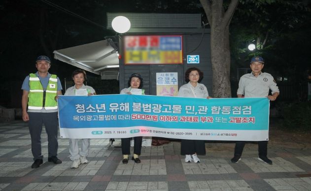 구는 불법광고물이 특히 기승하는 여름휴가철을 맞아 18개 동 직능단체 회원, 공무원, 옥외광고협회 양천지부 회원 등과 협력해 민관합동점검반을 출범하고, 이달 31일까지 대대적인 단속과 올바른 광고물 홍보 캠페인을 전개한다. 지난 19일 저녁에도 목동역, 오목교역, 신정네거리역 등 주요 지하철역과 다중인파 밀집지역을 대상으로 유해광고물 상습살포 야간단속 · 캠페인을 실시했다. 또한, 이달 말까지 각 동 공무원, 직능단체 회원 400여 명을 중심으로 지역 내 통학로 주변 주민인식 개선 활동을 지속 추진할 계획이다.