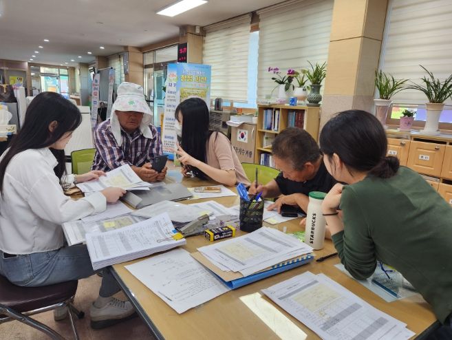 비가 소강상태에 접어들면서 피해 접수가 시작되면서 세 학생은 친절한 안내와 함께 주민들의 수해 피해 접수에 일손을 보태고 있다.