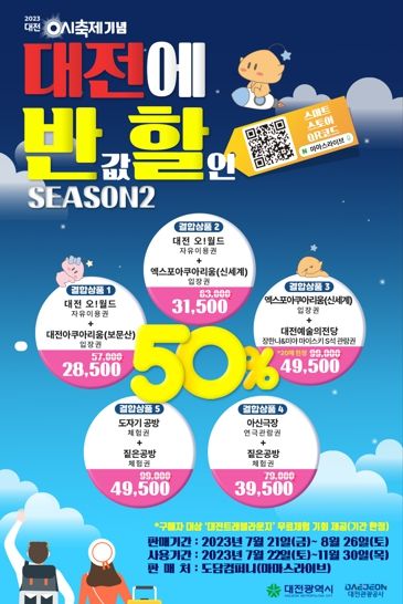 이번 초특가 할인행사는 지난해 시행한 ‘대전 관광상품 할인지원사업’ 시즌2 행사로, 문화 ‧ 공연 ‧ 체험 제휴시설을 추가해 상품 종류와 구매층을 확대했다.