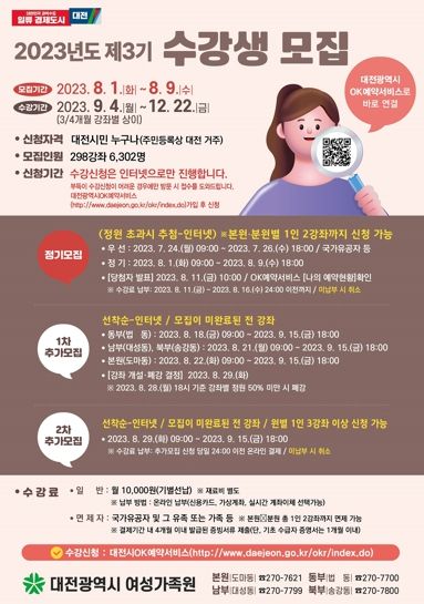 [제주교통복지신문 김강석 기자] 대전여성가족원은 오는 8월 1일 9시부터 8월 9일 18시까지 9일간 2023년 제3기 강좌 수강생 6,302명을 모집한다.