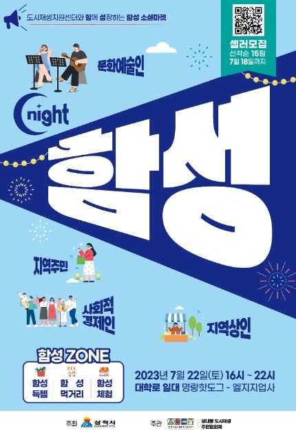 [제주교통복지신문 김강석 기자] 삼척시는 성내지구 도시재생 활성화를 위해 오는 7월 22일(토) 오후 4시부터 밤 10시까지 대학로 일대(명랑 핫도그~대박 호떡 구간)에서 제9회 성내지구 도시재생 소셜마켓 ‘함께 성장하는, 함성’ 행사를 개최한다.