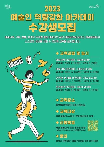 [제주교통복지신문 김강석 기자] (재)화성시문화재단 예술지원센터는 ‘2023 예술인 역량강화 아카데미’의 3회차 프로그램 ‘저작권 및 법률 아카데미’ 수강생을 오는 8월 8일(화)까지 모집한다. 해당 교육은 8월 8일(화) 14시 동탄복합문화센터 소회의실에서 약 3시간 동안 진행 예정이다.