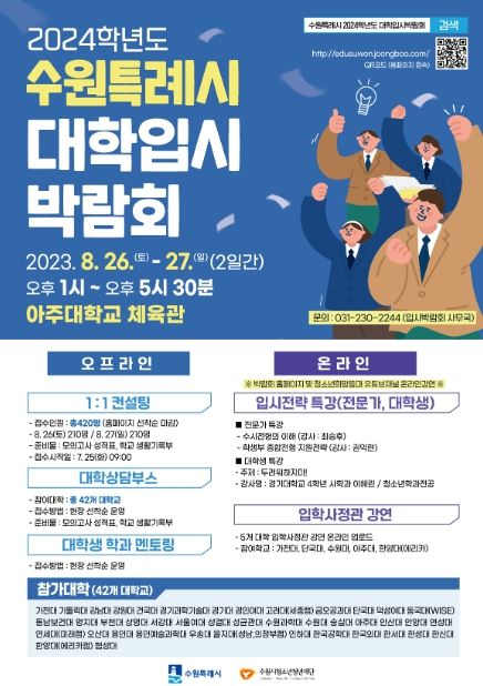 [제주교통복지신문 김강석 기자] 수원시가 8월 26일~27일 아주대학교 체육관에서 고등학교 3학년 수험생과 학부모를 대상으로 ‘2024학년도 대학입시박람회’를 개최한다.