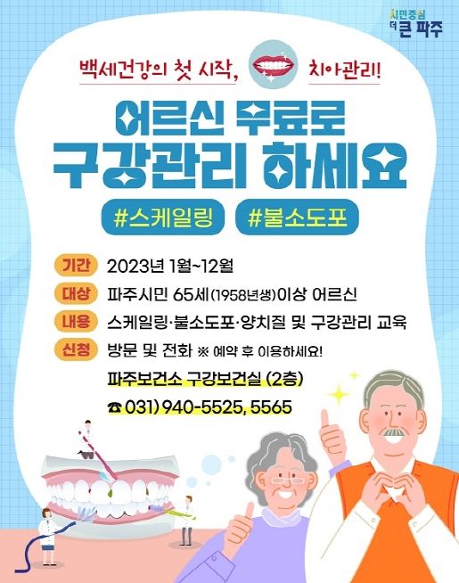 [제주교통복지신문 김강석 기자] 파주보건소는 65세 이상 어르신을 대상으로 연중 무료로 스케일링과 불소도포를 실시한다.