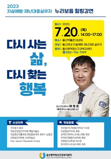 [제주교통복지신문 김강석 기자] 울산시는 울산광역정신건강복지센터(센터장 김경승)가 7월 20일 오후 2시 울산박물관 대강당에서 ‘2023년 누리보듬 힐링강연’을 마련한다고 밝혔다.