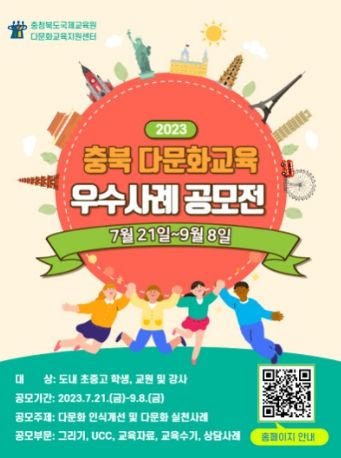 [제주교통복지신문 김강석 기자] 충청북도교육청 직속기관 국제교육원(원장 이광우)은 함께하는 사회를 위한 인성, 민주 시민 교육과 학교 현장 다문화 교육 활성화를 위해 다문화교육 우수사례 공모전을 개최한다고 밝혔다.