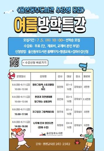[제주교통복지신문 김강석 기자] 울산동부도서관(관장 한미화)은 오는 8월 8일부터 11일까지 초등학생을 대상으로 ‘여름방학 특강’을 운영한다.