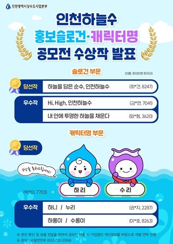이번 공모는 지난 3월 22일 선포 1주년을 맞은 인천 수돗물의 새 브랜드‘인천하늘수’의 비전을 담은 홍보 슬로건과 친근한 모습으로 단장한 인천하늘수 캐릭터 이름을 시민과 함께 만들어 나가고자 기획됐는데, 슬로건 부문 443건, 캐릭터명 부문 583건으로 총 1,026건의 작품이 접수됐다.
