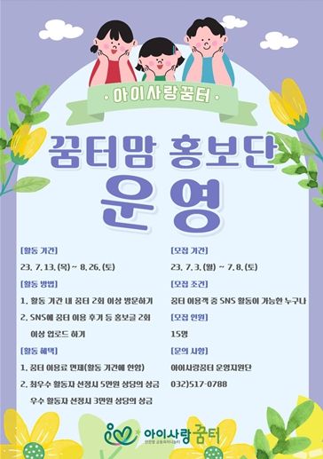 홍보 단원은 앞으로 한 달여간 아이사랑꿈터의 놀이 공간과 프로그램 등에 대한 정보를 본인만의 방식으로 개인 SNS 계정에 소개하고, 양육자의 입장에서 생생한 이용 경험을 널리 알릴 계획이다. 활동이 마무리되면 우수 활동자에게 별도의 시상도 예정돼 있다.