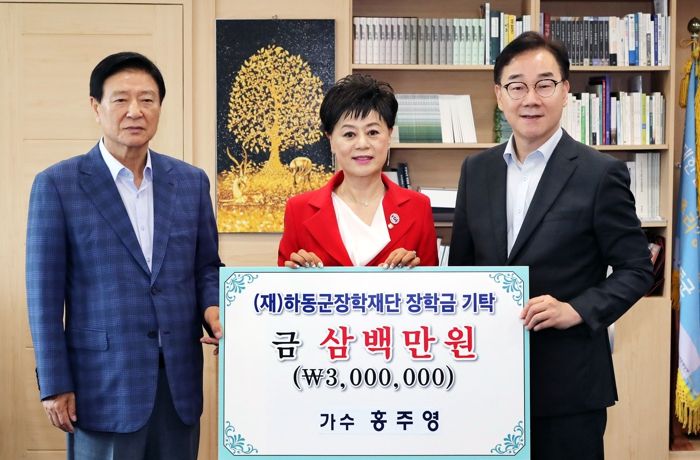 [제주교통복지신문 김강석 기자] (재)하동군장학재단은 하동 출신 가수 홍주영이 지난 19일 군수 집무실을 찾아 고향 후배 사랑을 위해 써달라며 장학기금 300만원을 기탁했다고 20일 밝혔다.