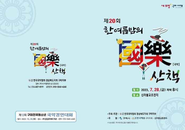 [제주교통복지신문 김강석 기자] 구미시는 28일 신라불교초전지에서 (사)한국국악협회 구미지부 주관으로'제20회 한 여름밤의 국악 산책'을 개최한다.