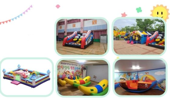 에어바운스는 성장 단계별 인기 있는 종류로 골라 매회 5개씩 설치한다. 미취학 아이들은 큰블럭 놀이, 초등 저학년은 바나나시소, 초등 고학년은 디스코팡팡바운스, 허리케인바운스 등을 설치해 균형 잡힌 신체 놀이 기회를 제공한다.