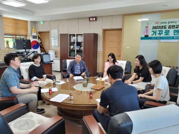 [제주교통복지신문 김강석 기자] 경상북도김천교육지원청은 선배가 후배를 가르치는 기존 멘토링의 반대 개념으로, MZ세대 교직원이 선배나 고위 관리자의 멘토가 되어 “요즘 세상”을 배우는 소통 방식을 실현하기 위하여 2023년 7월 19일 11:30에 김천교육지원청 교육장실에서 2023년 거꾸로 멘토링을 실시했다.