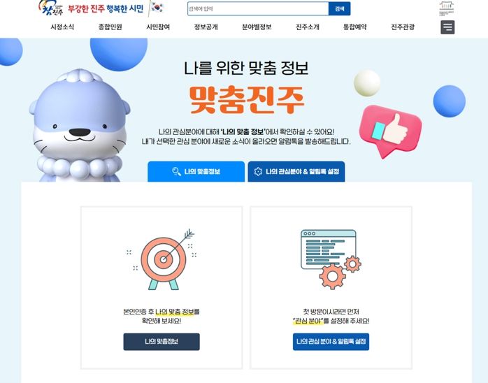 나를 위한 맞춤정보‘맞춤 진주’서비스는 홈페이지에서 제공되는 다양한 소식 중 나의 관심분야 및 알림톡을 설정하면 카카오톡이나 문자를 통해 실시간으로 정보를 알려주는 서비스이다.