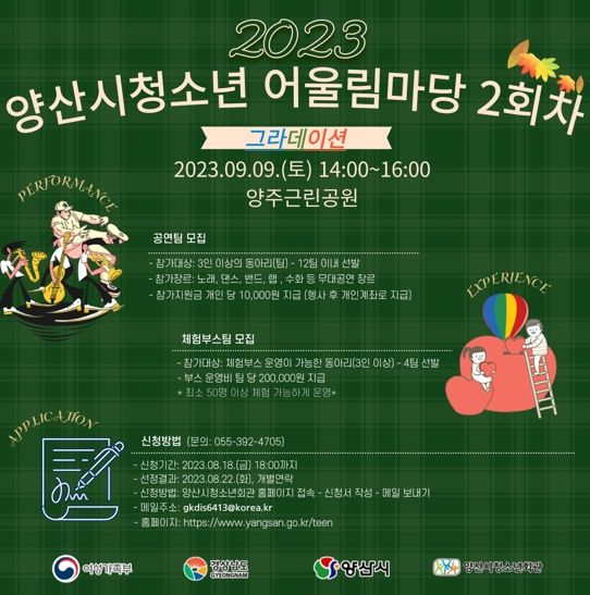 청소년동아리(팀)이라면 누구나 신청‧참여할 수 있으며 8월 18일 18:00까지 양산시청소년광장 홈페이지 공지사항에 게시된 청소년어울림마당 모집 요강을 참고하여 신청하면 된다.
