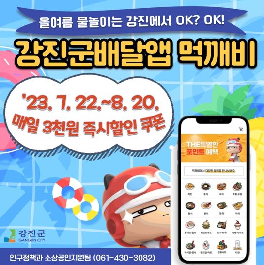 평일에는 즉시 할인 3천 원 쿠폰이, 주말에는 기존에 실시되던 배달료 3천 원 할인 쿠폰이 적용돼, 물놀이장 개장기간 동안 먹깨비 이용 시 매일 3천 원씩 할인되는 혜택을 누릴 수 있다. 이 이벤트는 강진 3대 물놀이장(강진V랜드. 초당림, 석문공원) 개장기간 동안 운영되며, 예산 사업비 1,500만 원 소진 시까지 진행될 예정이다.