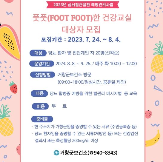 [제주교통복지신문 김강석 기자] 거창군은 오늘 8월 8일부터 매주 화요일 오전(10∼12시) 당뇨병 환자 또는 고위험군에 속하는 군민을 대상으로 당뇨 합병증 예방을 위한 체계적인 발 관리 교실 ‘풋풋(FOOT FOOT)한 건강교실’을 운영한다.