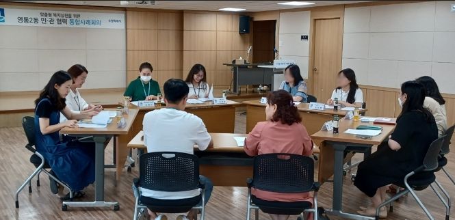 지난 19일에는 영통2동 공영화 동장과 사례관리담당직원을 비롯해 수원시성인정신건강센터, 영통종합사회복지관, 경기도서민금융복지지원센터, 원천동 통합사례관리사 등 10명이 참석해 기관별 지원가능 방법 등을 검토하고 위기가구 특성에 맞는 복지지원 계획을 수립했다.