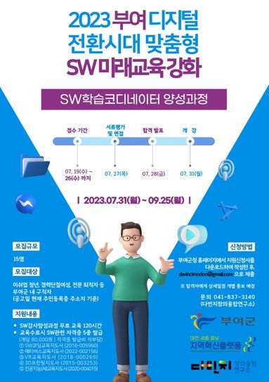 [제주교통복지신문 김강석 기자] 부여군에서는 오는 7월 31일 디지털 전환시대를 맞아 아동·청소년에게 SW미래교육을 제공하기 위해 관내 거주하는 청년들을 대상으로 ‘SW학습코디네이터 양성과정’을 진행한다.