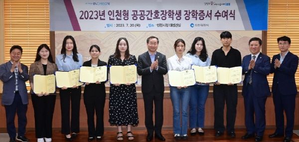 [제주교통복지신문 김강석 기자] 인천광역시는 20일 시청 대접견실에서 유정복 시장을 비롯한 인천의료원장, 인천인재평생교육진흥원 관계자 등 10여 명과 장학생 10명이 참석한 가운데 인천형 공공간호사 장학증서 수여식을 개최했다고 밝혔다.