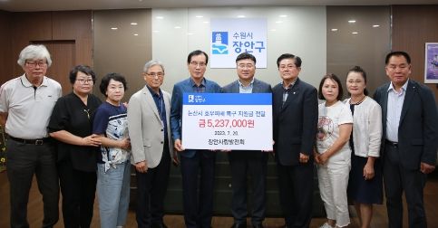 [제주교통복지신문 김강석 기자] 수원시 장안구 대표 봉사단체 장안사랑발전회가 20일 대규모 집중호우 피해를 입은 자매도시 충남 논산시를 돕는 데 써달라며 장안구청에 성금 523만 7천 원을 기탁했다.