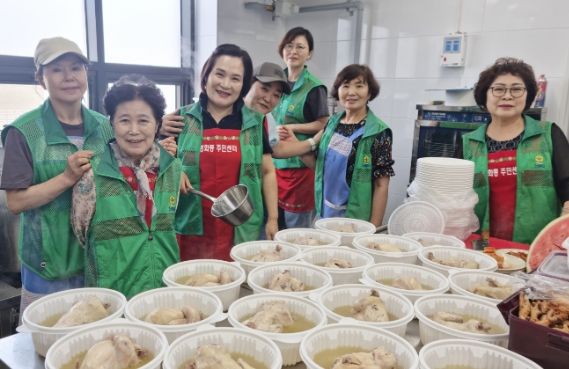 이른 아침 조리실에 모인 새마을부녀회 위원들은 장맛비가 그치고 폭염이 이어지는 가운데 대형 솥 옆에서 쉼 없이 삼계탕을 끓이며 구슬땀을 흘렸다.