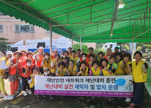오늘 행사는 재난대비 신속한 복구와 일상회복을 위한 훈련으로 경상남도자원봉사센터에서 세탁차와 밥차을 지원 받아 직접 음식을 조리하고 이불, 옷가지 등 세탁 훈련을 실시했으며, 또한 재능봉사자들의 도움을 받아 이·미용 봉사, 공연 등 미니체육대회를 함께 진행했다.