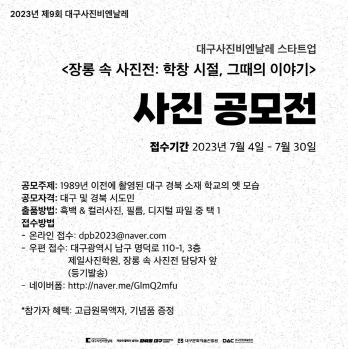 [제주교통복지신문 김강석 기자] 대구문화예술진흥원은 2023년 제9회 대구사진비엔날레의 일환으로 '장롱 속 사진전 – 학창시절, 그 때의 이야기'전을 개최한다. 이번 전시에는 과거 학창 시절 촬영됐던 다양한 모습(수학여행, 소풍, 운동회, 학예회 등)을 주제로 인물과 풍경의 옛 사진을 전시하여 작품에 담긴 대구의 역사·문화를 되새기고, 남녀노소가 공감하는 옛 추억을 되개기려 한다.