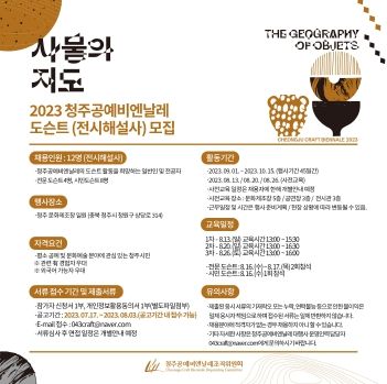 공예의 세계로 안내하는 길잡이가 돼 2023 청주공예비엔날레와 함께하고 싶은 시민은 공식홈페이지 해당 공고에서 신청 서류를 내려 받아 작성한 뒤 8월 3일까지 이메일로 제출하면 된다.