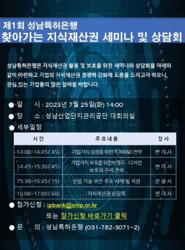 [제주교통복지신문 김강석 기자] 성남산업진흥원에서 운영 중인 성남특허은행은 오는 25일 중소벤처기업을 대상으로 지식재산권 활용 및 보호를 위한 ‘찾아가는 지식재산권 세미나 및 상담회’을 개최할 예정이다.