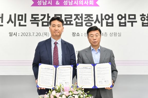시는 7월 20일 오후 2시 시청 4층 상황실에서 신상진 성남시장과 이승혁 성남시의사회장 등이 참석한 가운데 ‘전 시민 독감백신 무료 접종사업 추진에 관한 업무협약’을 했다.