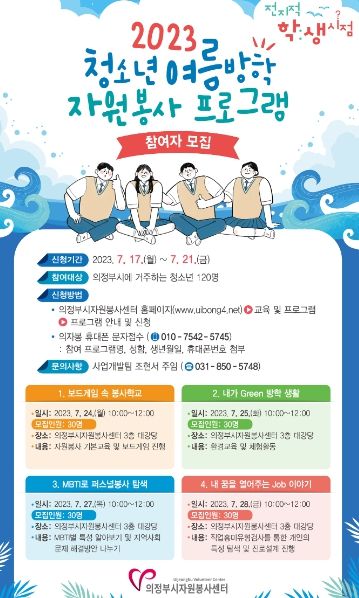 [제주교통복지신문 김강석 기자] 의정부시자원봉사센터는 7월 24일부터 7월 28일까지 의정부시 지역 청소년들을 대상으로 ‘청소년 여름방학 자원봉사 프로그램’을 운영한다.