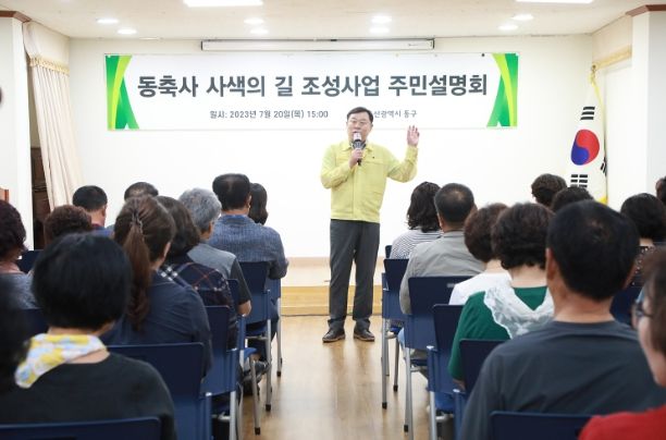 동구청은 7월 20일 오후 3시 남목3동 행정복지센터 2층 회의실에서 동축사 사색의 길 조성사업 주민설명회를 가졌다. 이날 설명회는 김종훈 구청장, 구의원을 비롯해 지역주민 등 50여 명이 참석한 가운데 숲길 정비 사업구간, 정비계획 등에 대한 구체적인 설명과 질의응답, 주민의견 청취 순으로 진행됐다. 주민 생활공간과 밀접한 지역 등산로 정비 사업에 대한 다양한 주민 의견을 반영하는 자리가 됐다.