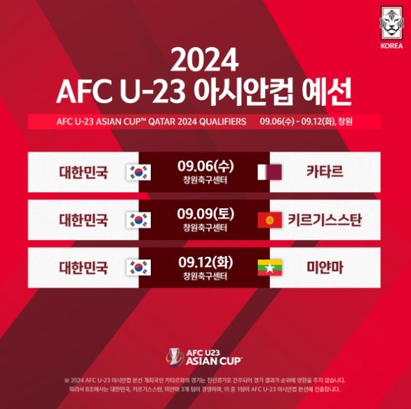 4개국 풀리그로 열리는 B조 예선에서 한국은 6일 카타르, 9일 키르기스스탄, 12일 미얀마와 차례로 맞붙는다. 이번 U-23 아시안컵 예선은 내년 파리올림픽 아시아 1차 예선을 겸하며, 황선홍 감독이 이끄는 22세 이하 올림픽 대표팀이 출전한다.