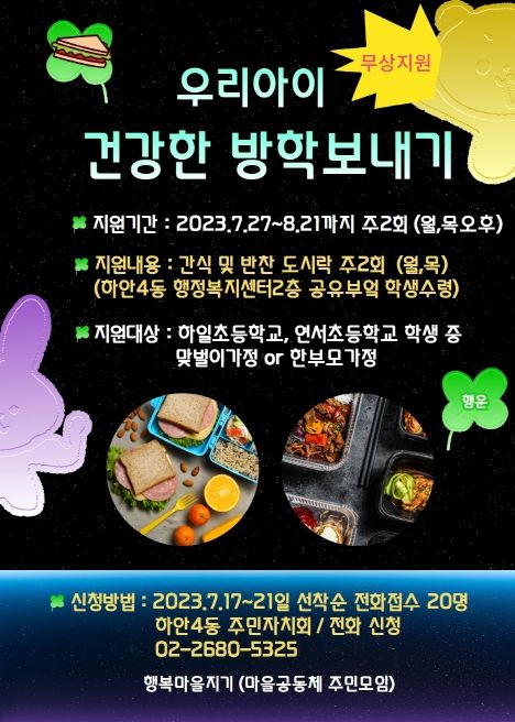 최미정 하안4동 행복마을 지원단 대표는 “자라나는 아이들에게 따뜻한 반찬과 간식으로 마음을 전할 수 있어서 기쁘다”며 “앞으로도 다양한 사업을 통해 마을공동체의 의미를 다시 한번 되새기는 기회를 만들 수 있도록 노력을 기울이겠다”고 말했다.