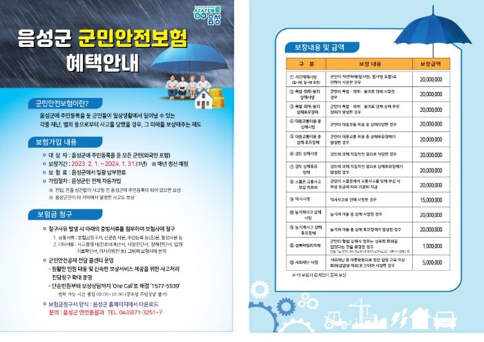 군민 안전 보험은 사고를 당했을 경우 음성군과 계약이 체결된 보험사를 통해 보험금을 지급 받을 수 있는 제도로 수혜 대상은 모든 군민이다.