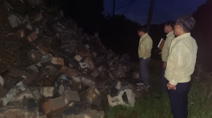 군 공무원들이 찾은 현장은 옹벽 자재가 길가로 쏟아져 길을 막고 있었으며 통행이 불가능한 상황이었다.