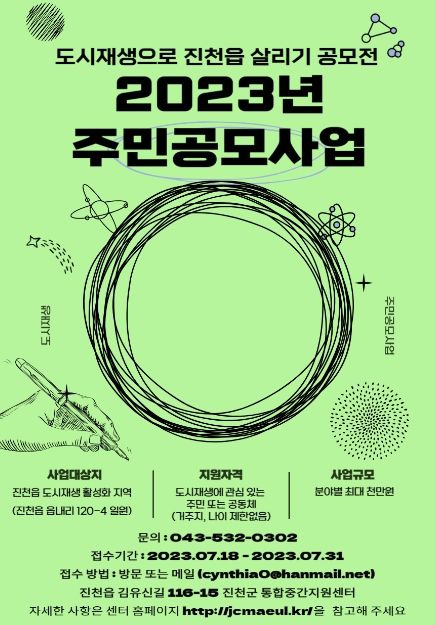 [제주교통복지신문 김강석 기자] 진천군은 오는 31일까지 ‘2023 진천읍 도시재생 주민공모사업’참여자를 모집한다고 21일 밝혔다.