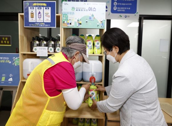 사업 추진을 위해 구는 지난달 1일 애경산업과 업무 협약을 맺었다. 증가하는 세제 용기 재사용 요구에 부응하고자 어르신 일자리와 연계한 세제 ‘리필 스테이션’을 운영하기로 했다. 애경산업은 향후 2년간 세탁세제, 주방세제 등 약 5억 원 상당 생활용품을 은평구에 후원한다.