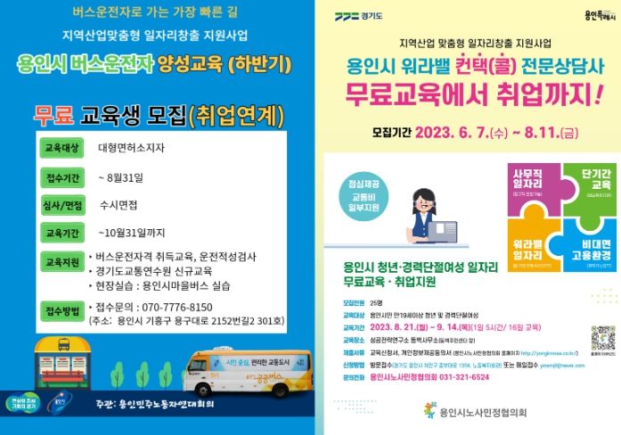 참가 자격과 신청 방법 등은 버스운전사 양성 교육을 담당하는 용인민주노동자연대회의와 워라벨 컨택상담사 전문가 양성 교육 담당인 용인시노사민정협의회로 전화하면 자세히 안내받을 수 있다.