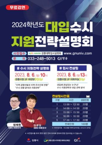 이번 설명회 및 컨설팅에 참여를 희망하는 중3에서 고3 학생 및 학부모는 강릉대학입시설명회 홈페이지로 사전접수하면 된다.