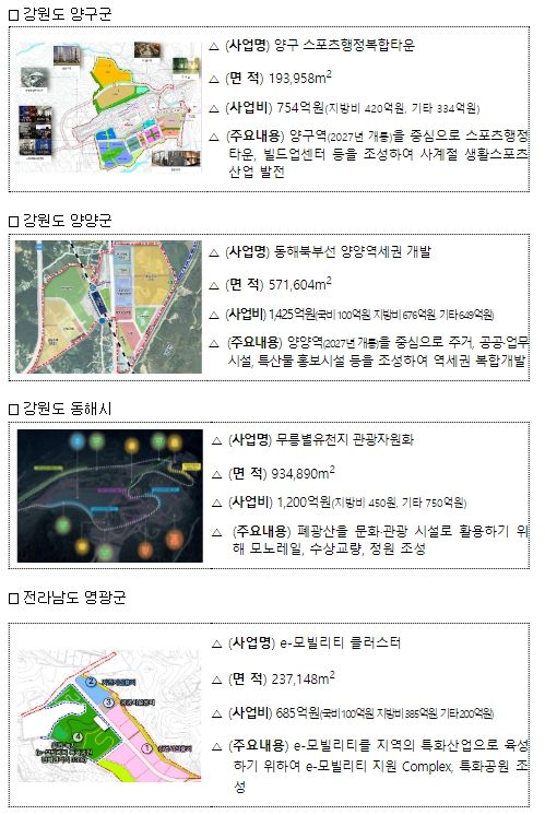 이번에 선정된 투자선도지구사업은 동해시의 무릉별유천지 관광자원화, 양구군의 스포츠 행정복합타운, 양양군의 양양역세권 개발, 영광군의 e-모빌리티 클러스터이며,지역수요맞춤지원사업은 정선군의 아트플랫폼, 괴산군의 한지복합문화센터, 보은군의 동거동락 나누는 어울터, 공주시의 정안초 살리기, 구례군의 워킹 촌스데이, 영주시의 일주 보행로길, 하동군의 하동차 엑스포가든이 선정됐다.