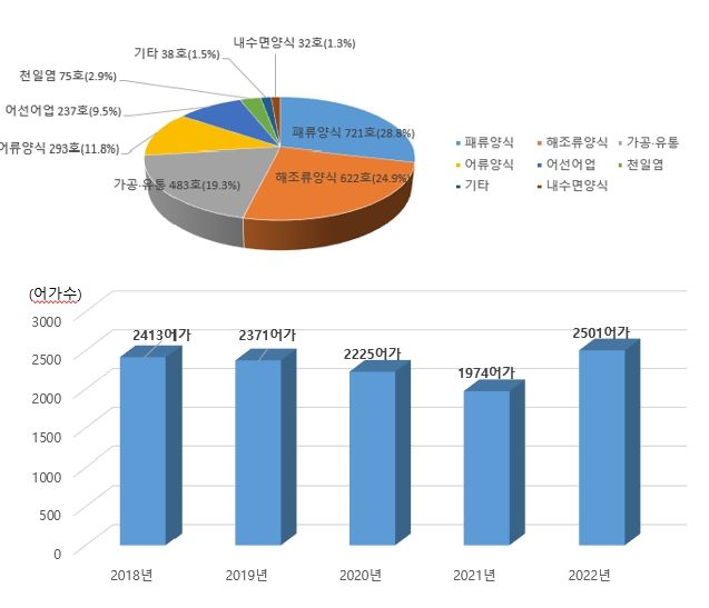 업종별로는 전복, 굴, 꼬막 등 패류 양식이 721어가(28.8%)로 가장 많았고 김·미역 등 해조류 양식 622어가(24.9%), 굴비 등 가공·유통 483어가(19.3%), 넙치·우럭 등 어류양식 293어가(11.8%), 어선어업 237어가(9.5%) 순이었다.