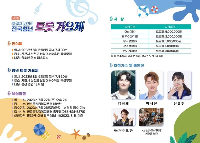 [제주교통복지신문 김강석 기자] 삼천포남일대청년트롯가요제 추진위원회는 8월 5일부터 6일까지 2일간 여름 피서철 대표 휴양·관광지인 삼천포 남일대해수욕장에서 ‘제3회 삼천포 남일대 전국청년트롯가요제’를 연다.