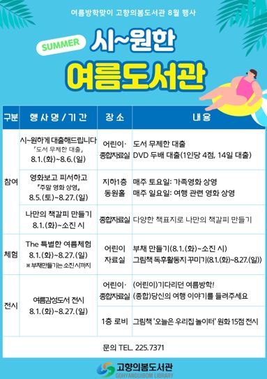 [제주교통복지신문 김강석 기자] 창원특례시 고향의봄도서관(의창도서관과, 오미숙과장)에서는 여름방학을 맞이하여 이용자들을 위한 “시~원한 여름도서관” 행사를 운영한다.