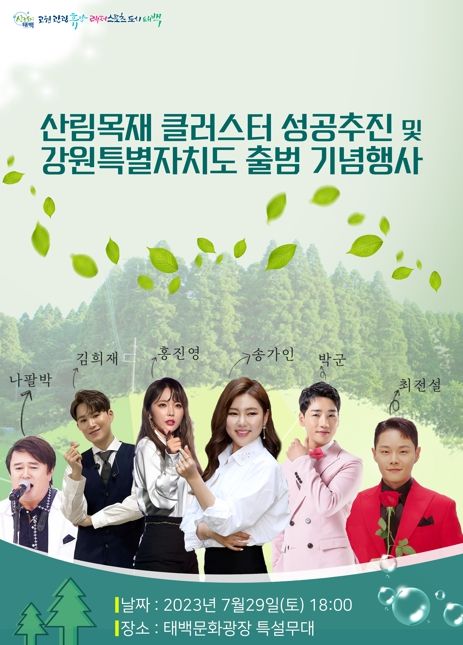 '산림·목재 클러스터 성공추진 및 강원특별자치도 출범 기념행사'는 오는 29일 오후 2시 태백문화예술회관 소공연장에서 개최되는 정책토론회를 시작으로 오후 6시부터 식전공연, 공식행사, 기념공연 순으로 진행되며, 기념공연에는 송가인, 김희재, 홍진영, 박군 등 인기가수 공연으로 분위기를 돋울 예정이다.