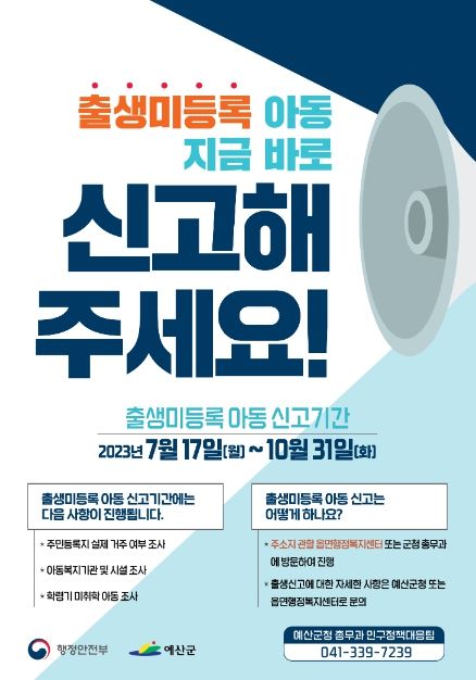 [제주교통복지신문 김강석 기자] 예산군은 제도 밖 출생 미등록 아동을 선제적으로 찾고 아동보호체계를 개선하기 위해 출생 미등록 아동 신고기간을 7월 17일부터 10월 31일까지 3개월간 운영한다.